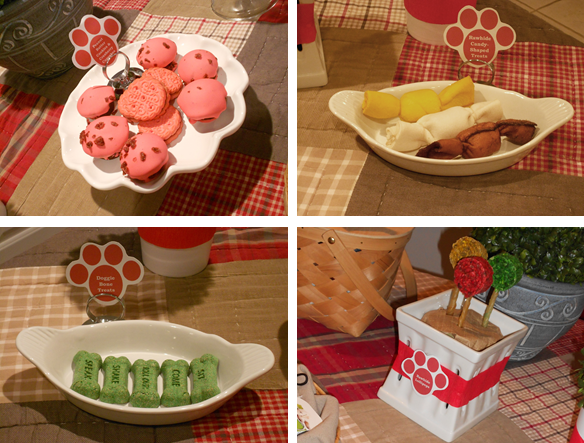 For the table, the featured color was red which was complimented beautifully by the boxwood greens that accented the table.  Simple white serving platters/dishes, used to display the goodies we bought, gave a nice contrast to the mixed red/brown plaid quilt that served as the tablecloth.  Paw print labels and red crepe ribbons rounded off the table.