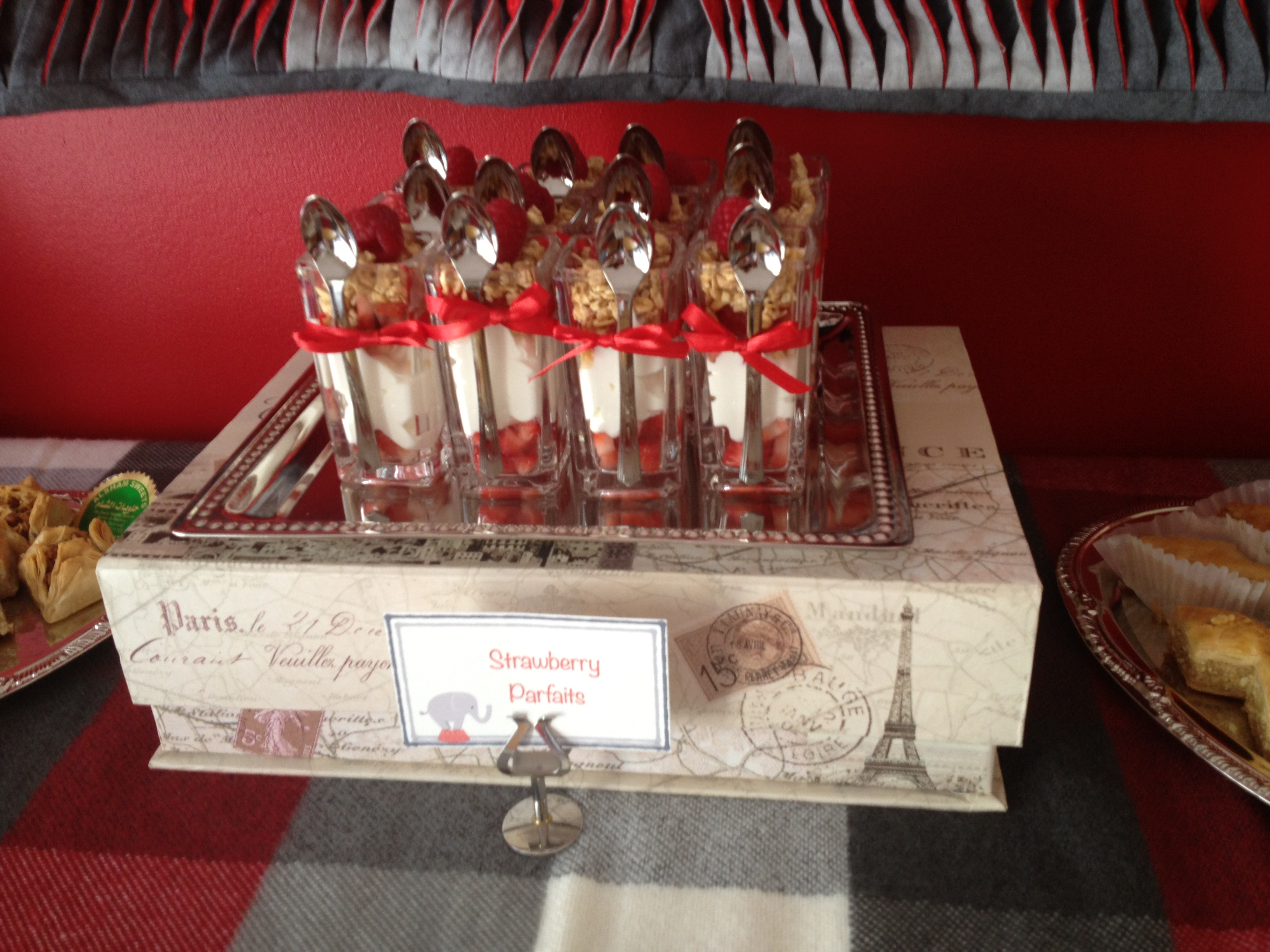 Other desserts at the table were yummy Middle Eastern sweets (provided by a family friend), mini strawberry parfaits (a’la me!), store-bought blueberry muffins and cupcakes decorated with elephant toppers that I created with the thanks of easy to use punches, all arranged on top of a plaid blanket showcasing the party’s theme colors.  And to bring it all together, the dessert table’s back drop was an amazing quilt that was handmade by one of the family’s friends.