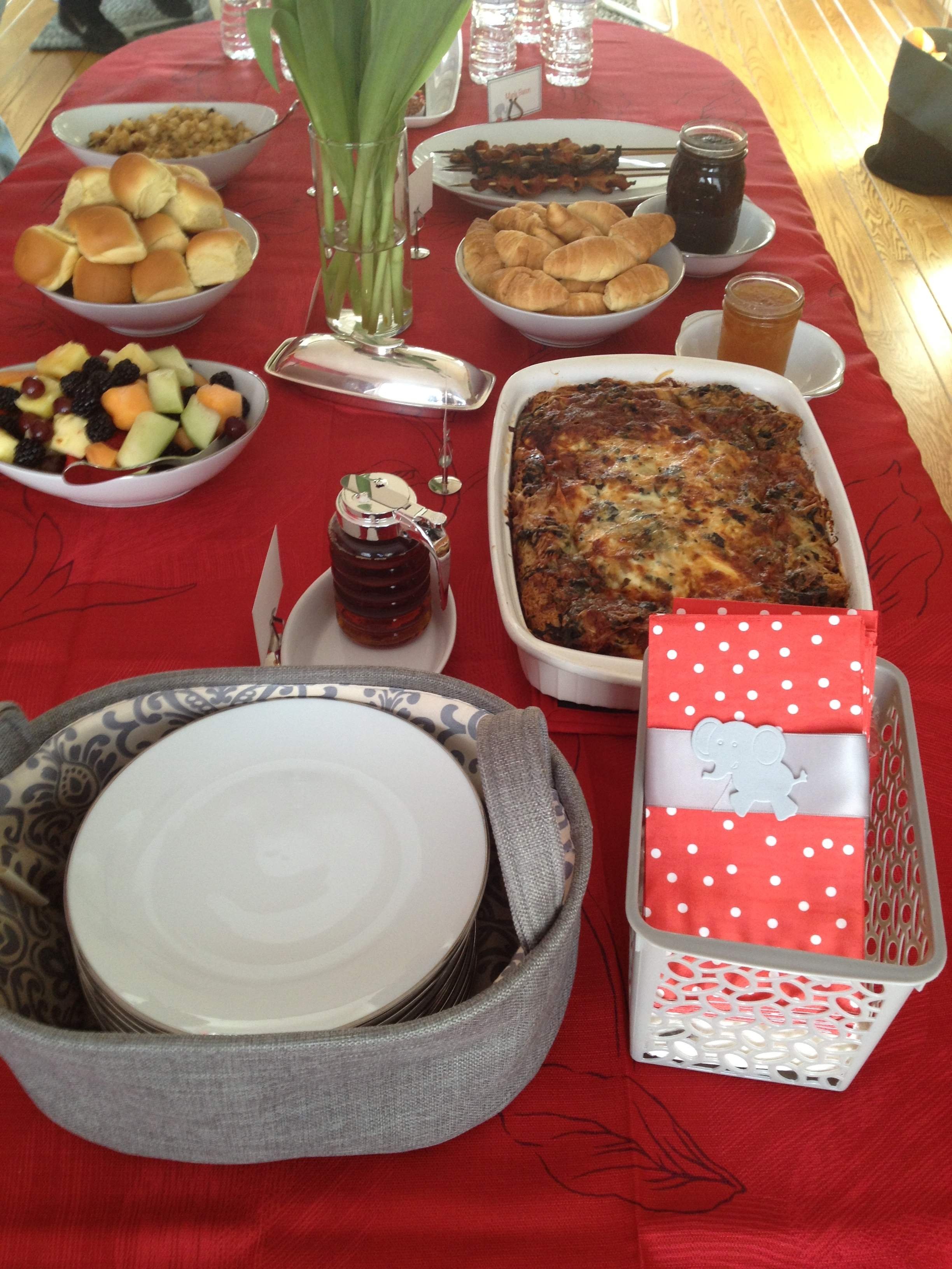 As for main courses and sides, the menu was brunch inspired and prepared by the guest-of-honor’s mom.  Delicious baked strata and baked french toast was accompanied by home fries and skewered maple bacon.  Kids also had a choice of cereal, as well as their own red bowls, plates and utensils (in red polka dot bags) fashionably tied with silver gray bows and topped with cute elephant stickers.
