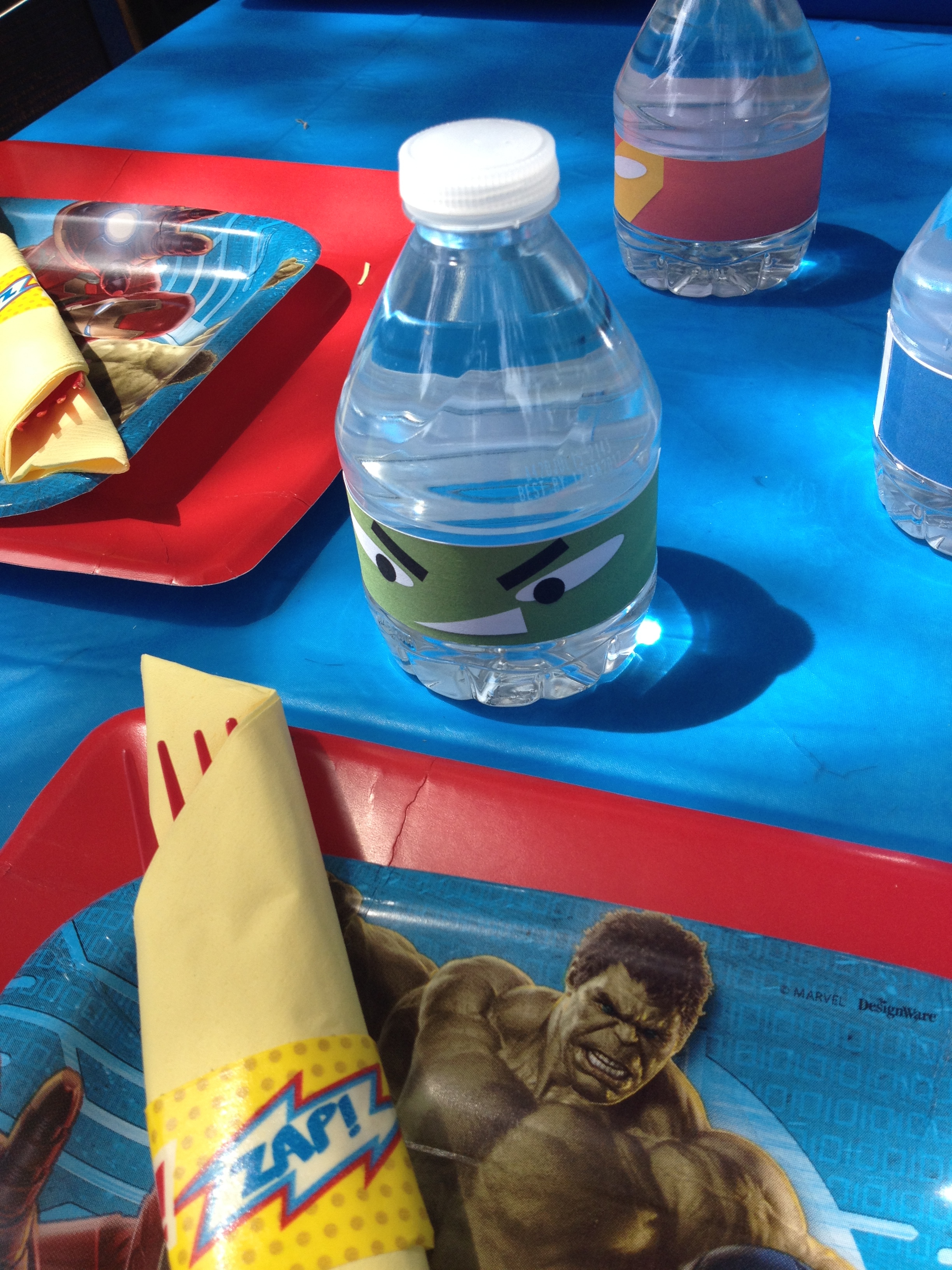 Inspiration Senses jumped in with creating the custom “T” mini signs, along with providing character & exclamation signs for the dessert table and dining table centerpieces. In addition, I created the chevron mini cupcake wrappers and candy-covered Oreos to match the fabulous birthday cake. For chips and puffs, I made comic cones to hold the salty treats. However, I think my favorite wrappers were the custom Avengers’ character water labels — an Inspiration Senses exclusive. (Download the free PDF here.)