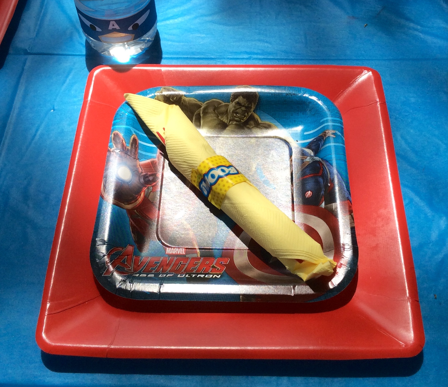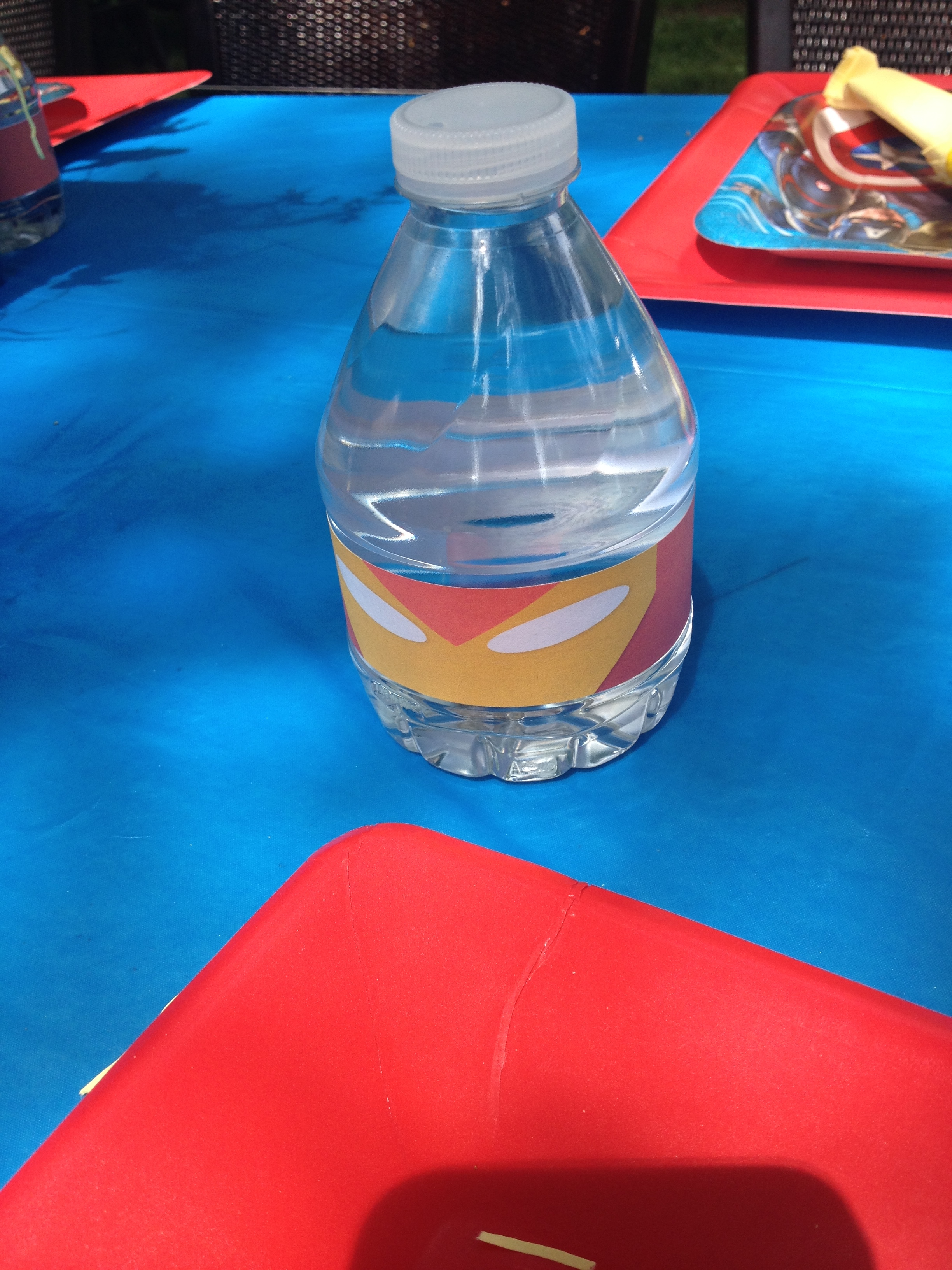 Games… Games… Games… No party is complete unless there’s games! The family constructed three stations – Hulk Smashing: where kids got to wear the Hulk gloves and smash ice cream cones; Webslinger Training: where the kids sprayed silly string around; Thor’s Thunder and Rain Challenge: where the kids burst open hanging water balloons with a makeshift Thor hammer. I made signs for each station, as well as create the label for the silly string cans. Fun!