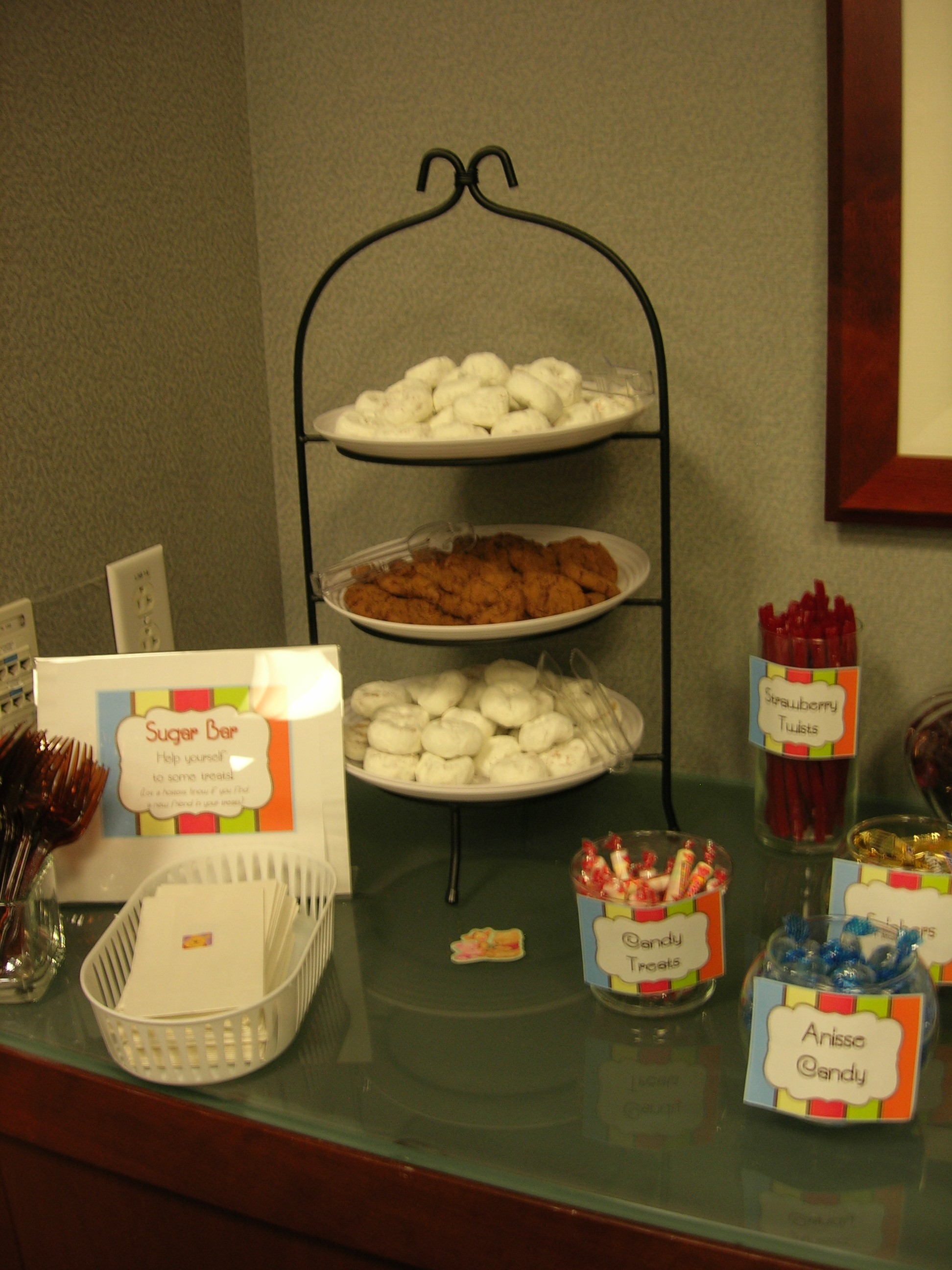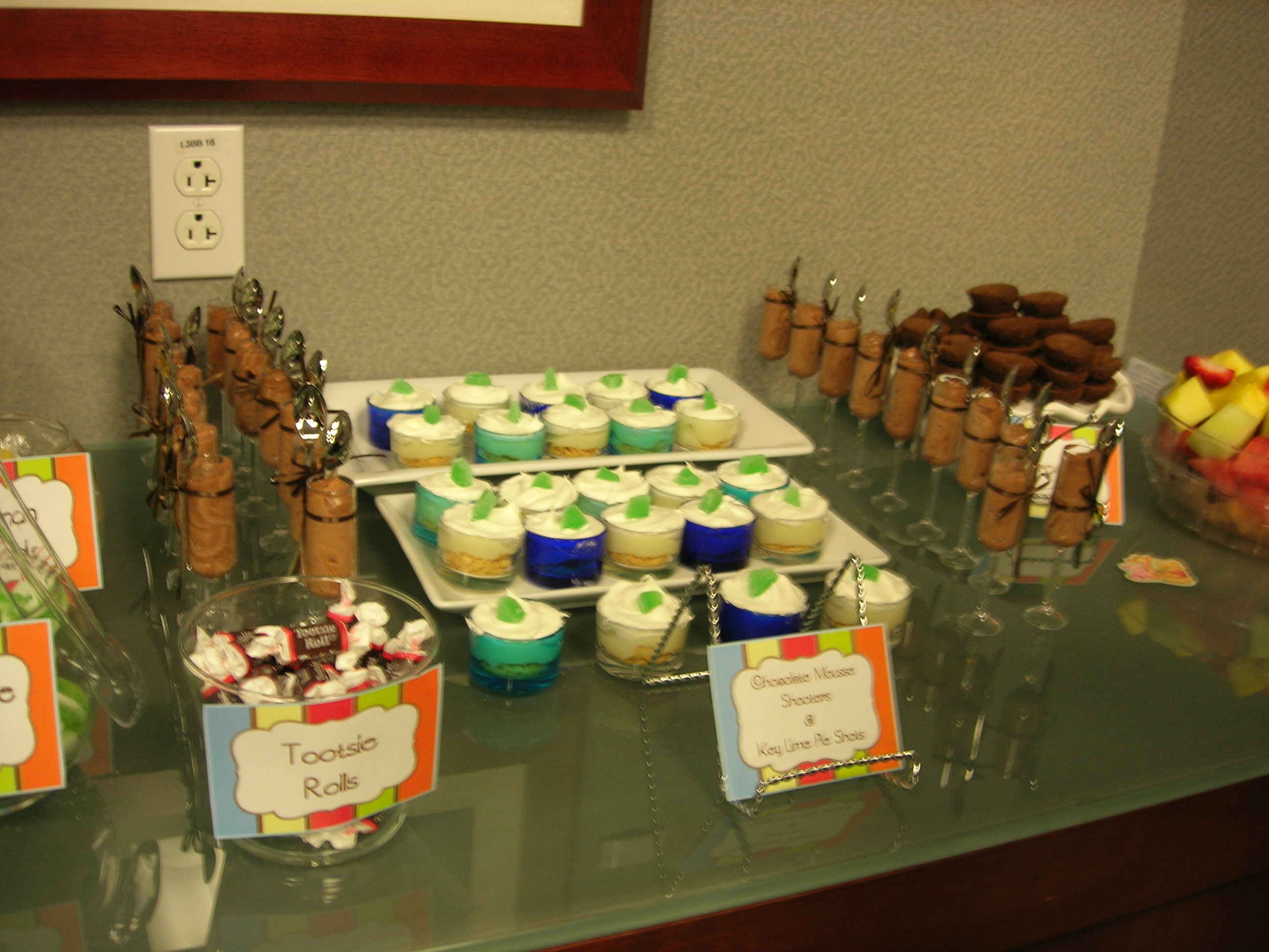 The yummy sugar bar was not just a treat for the taste buds, but for the eyes as well, with a rainbow of sweets seen through glass jars. All of the guest of honor’s favorites were there — donuts, cookies, mini chocolate mousse, mini key lime pies, brownies, popcorn and an assortment of candies. One of my favorites was the mini chocolate mousse champagne flutes with a ribbon-tied spoon (so cute!).